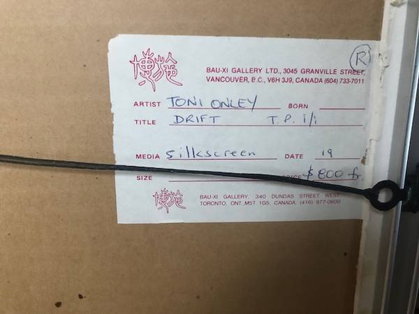 Framed artist proof of "Drift" by Toni Onley. Bought at the Bau-Xi gallery on South Granville in 1970s for $800.