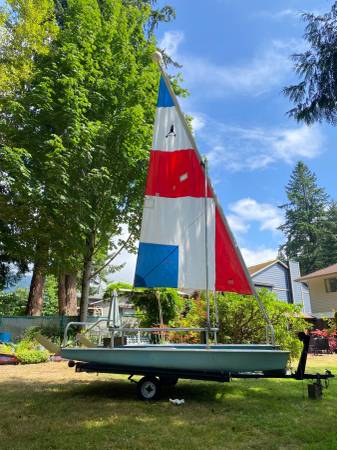 Ready for fun on the water? This 12-foot Aqua Cat catamaran is a great little sailboat — stable, easy to sail, and perfect for lakes or coastal breezes.