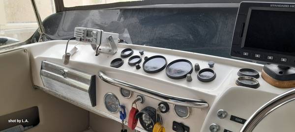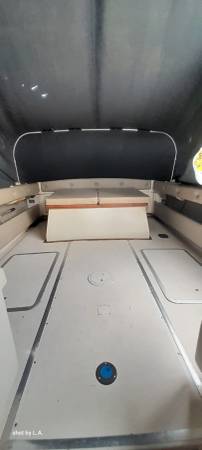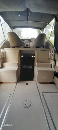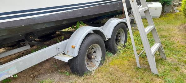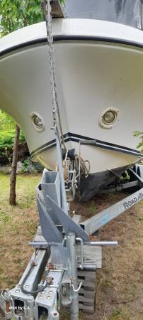 Twin 140 Volvos (winterized in 2020). Includes trailer, Scotty downriggers, and crab traps. Fish finder needs calibration. Small tear in the canvas. Interior seats will likely need replacing.