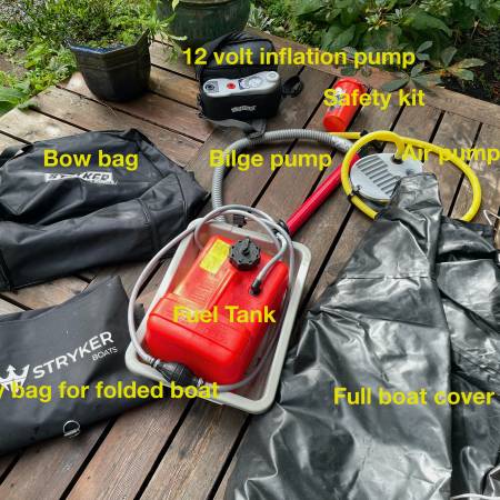 Includes gas tank, 12 volt inflator pump, safety kit, boat cover, bimini, bow bag, midship seat cushion and storage bag under the seat, foot pump, manual bilge pump, bag for transporting the deflated boat.