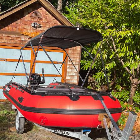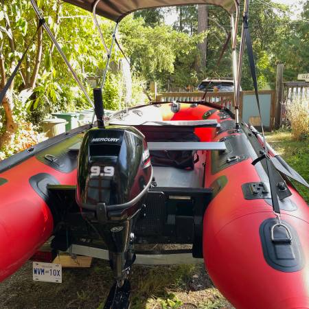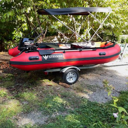 12.5 ft (Stryker LX380) inflatable with new technology high pressure air floor. 9.9 HP Mercury with about 20 hours. Marlon trailer with 1500 lb capacity. Trailer, boat and motor were bought new this year.