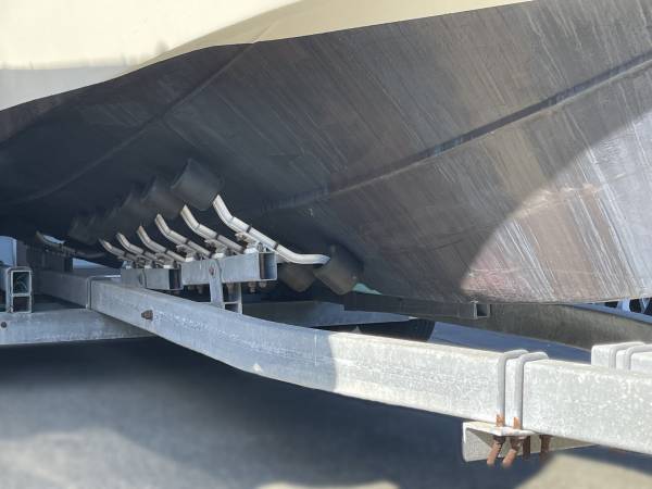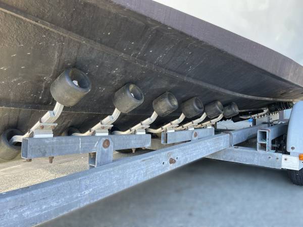 Custom dual axel Highliner, constructed of galvanized metal with roller support brackets for easy launch and recovery. Hydraulic over electric braking system and 2” 5/16 ball hitch.