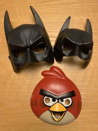- Masks: kid-sized Angry birds, adult + kid Batman ... $5 for set