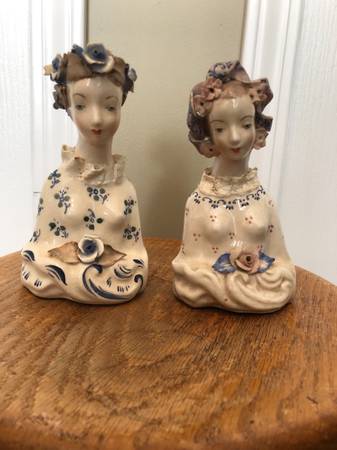 Antique Pair of German Artist Stamped Ladies in Blue Lace Porcelain Figurines 6" Tall