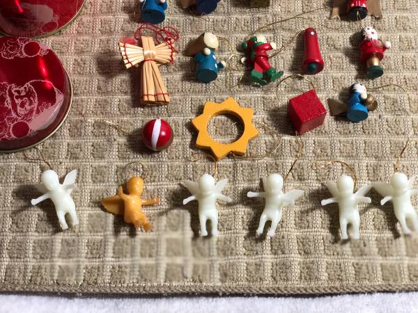 Lot Of Miniature Mostly Made Of Wood Christmas Decorations With Metal Storage Container