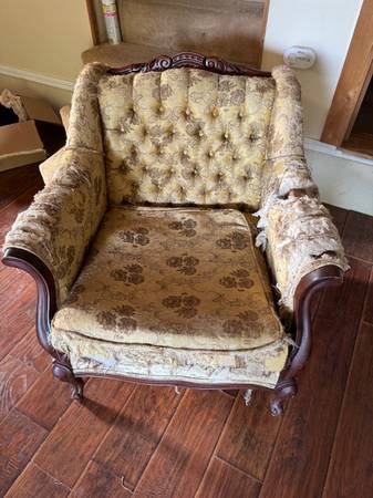 These are really well constructed pieces. Beautifully carved. Solid wood. Strong frame. Just needs to be reupholstered